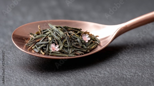 © Katsiaryna, Fototapeta premium Sencha Green Tea Leaves on Sakura Spoon, Japanese Tea Ceremony Close-Up