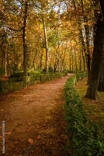 © Guillermo, Obraz premium Sendero con curvas en el parque. Sensación de paz y calma. Bosque de colores cálidos. Imagen vertical