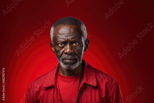 © Valeriia, Fototapeta premium Senior adult African American male man wearing red shirt standing over studio isolated red background. Skeptic black nervous, disapproving expression on face. Social issues hunger and suffer concept