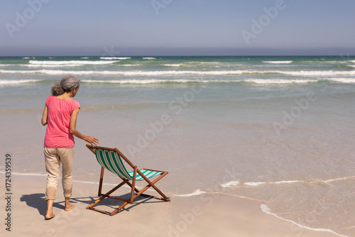 Naklejka premium Senior African American woman positioning striped beach chair on wet sand at ocean edge, copy space