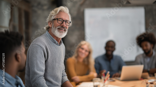 © tiagozr, Obraz premium Senior businessman leading meeting with diverse team.