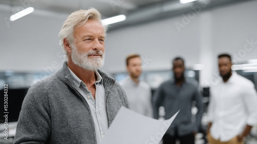 © Phirakhup, Obraz premium Senior businessman presents ideas confidently while colleagues observe attentively.