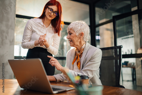 © Zamrznuti tonovi, Obraz premium Senior businesswoman discussing paperwork on tablet with her worker.