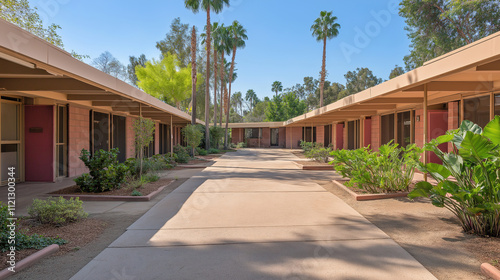 Fototapeta premium Senior care facility exterior with well-maintained garden and welcoming entrance. Emphasizing comfort and dignity in elderly living environments.