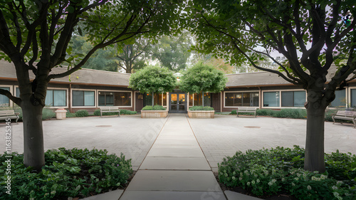 © dang, Fototapeta premium Senior care facility exterior with well-maintained garden and welcoming entrance. Emphasizing comfort and dignity in elderly living environments.