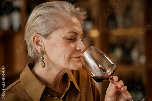© Seventyfour, Naklejka premium Senior Caucasian woman holding wine glass, smelling red wine during tasting session, eyes closed, short gray hair, standing in front of blurred wine bottles on shelves
