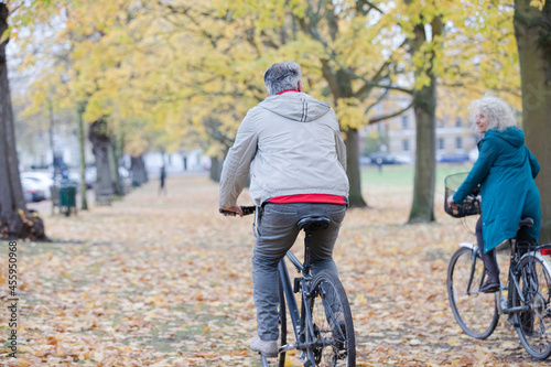 © KOTO, Obraz premium Senior couple bike riding among leaves and trees in autumn park