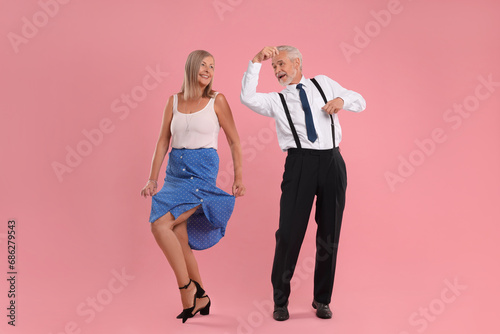 Fototapeta premium Senior couple dancing together on pink background