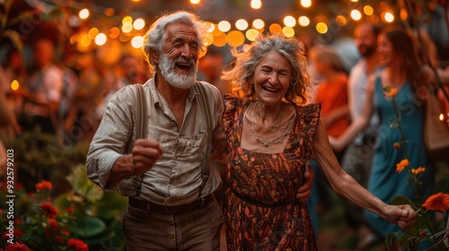 © Hvkk, Obraz premium senior couple,family dancing,garden party outside in the backyard