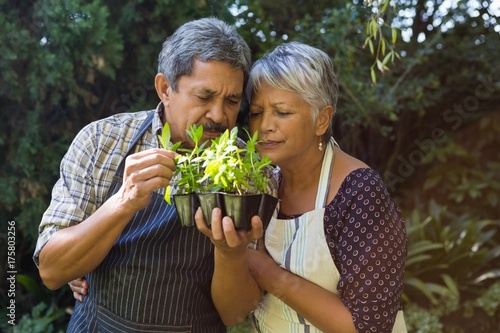 © WavebreakMediaMicro, Obraz premium Senior couple smelling plants in garden