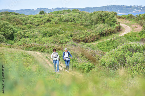 © goodluz, Obraz premium Senior couple walking on hiking track by the coast