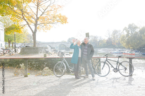 © KOTO, Obraz premium Senior couple with bicycles taking selfie at autumn river