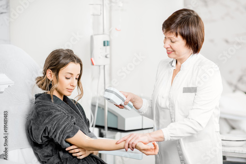 Fototapeta premium Senior doctor finding veins with vein scanner device to a young patient in a medical resort