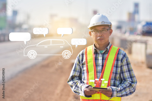 Fototapeta premium Senior Engineering holding tablet data technology working on road...