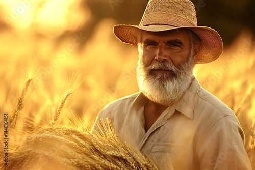 © Oleh, Fototapeta premium Senior farmer holding wheat stalks in golden field at sunset