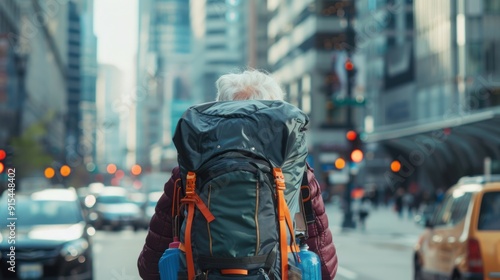 © CStock, Obraz premium Senior female backpacker carrying a full bag walking in a big city