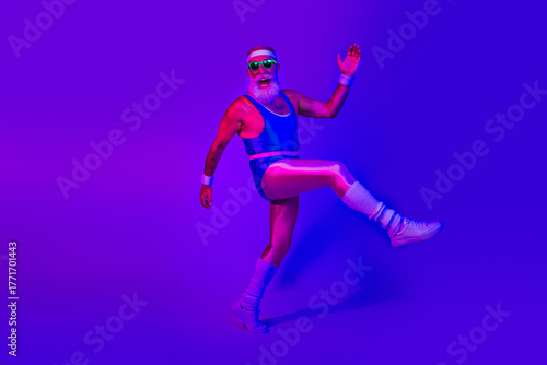 © deagreez, Fototapeta premium Senior fitness icon in retro athletic wear leaps in a neon blue and purple studio for an energetic lifestyle and wellness advertising vibe