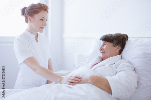 © Photographee.eu, Obraz premium Senior grey woman lying in white hospital bed with young helpful nurse holding her hand