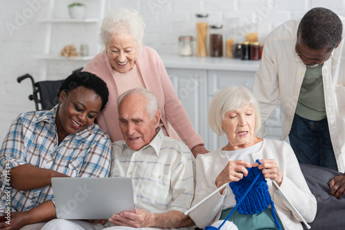 © LIGHTFIELD STUDIOS, Fototapeta premium Senior interracial pensioners spending time with yarn and laptop in nursing home