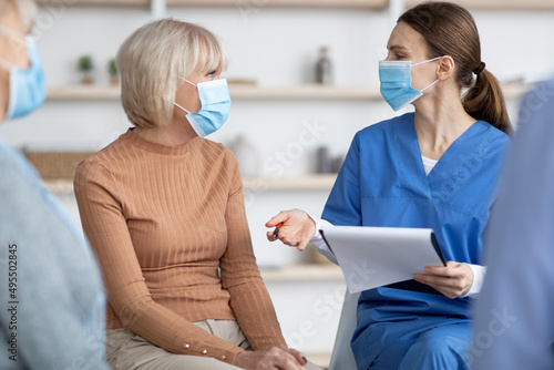 Fototapeta premium Senior ladies in face masks having conversation with nurse