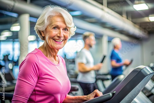 © Sandra, Obraz premium Senior lady finds strength and fitness on the gym treadmill.