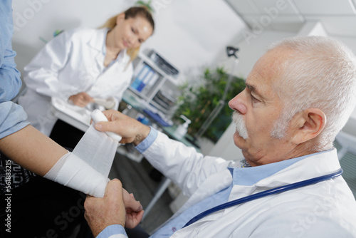 Fototapeta premium senior male doctor bandaging his patients arm
