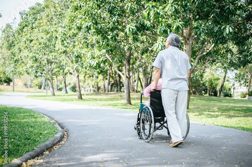 © Johnstocker, Fototapeta premium Senior man caring for disabled wife in his wheelchair.