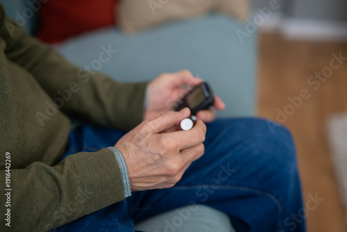 © Dexon Dee, Obraz premium Senior man checking blood sugar with glucometer