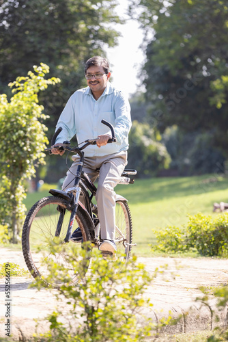 Obraz premium Senior man enjoying and having fun riding bicycle at park