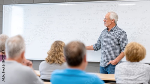 © Дмитрий Баронин, Obraz premium Senior man in checkered shirt teaching adult learners in classroom, engaging with students, demonstrating effective teaching methods in a collaborative learning environment