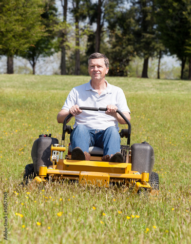 Fototapeta premium Senior man on zero turn lawn mower on turf