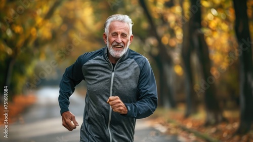 © Ilmi, Obraz premium senior man running for healthy lifestyle for longevity. exercise in a park