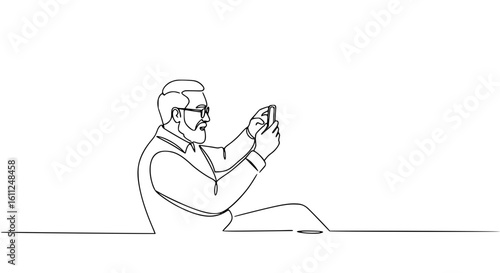 Fototapeta premium Senior man sitting and using smartphone in single line outline vector