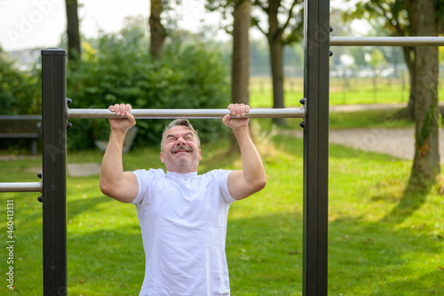 Fototapeta premium Senior man straining to pull himself up by the arms