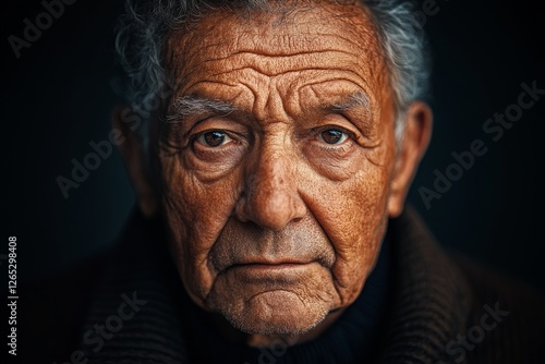 © ChaoticMind, Fototapeta premium Senior man with expressive wrinkles gazes intensely at the camera in a dark, moody setting