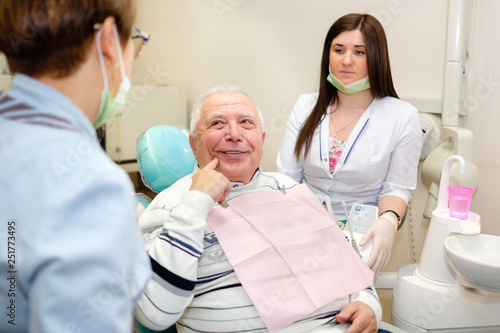 Fototapeta premium Senior man 70-75 years old, having visit to dental office for fixed toothache