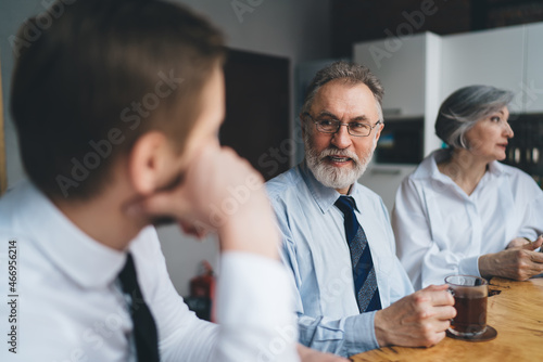 © BullRun, Obraz premium Senior manager speaking with colleague at workplace