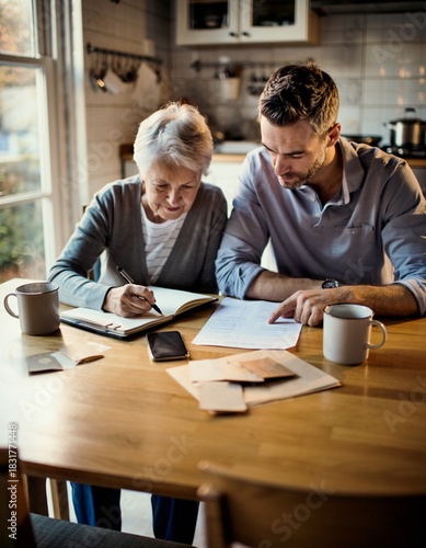 © Kim de Been, Fototapeta premium Senior Mother and Adult Son Collaborating on Financial Planning at Home