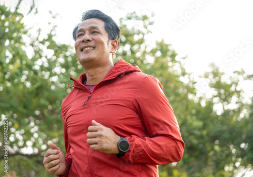 © Chanakon, Obraz premium Senior old man runner exercise outdoor nature park. fitness man jogging wearing sportswear. Mature athlete man in sportswear Workout running at public park. Health and activity old man lifestyle