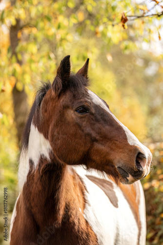 Obraz premium Senior pinto gelding with brown and white coat standing outdoors in soft autumn light