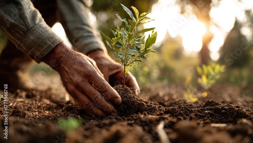 © Pix Noa, Naklejka premium Senior's hands planting a young tree sapling