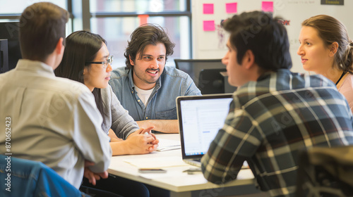 © XaMaps, Obraz premium Senior software engineer mentoring a group of junior developers during a code review session at tech startup office.