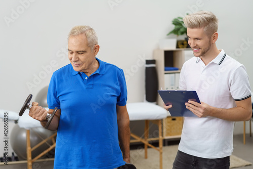 Obraz premium senior trainiert mit hanteln mit einem physiotherapeut