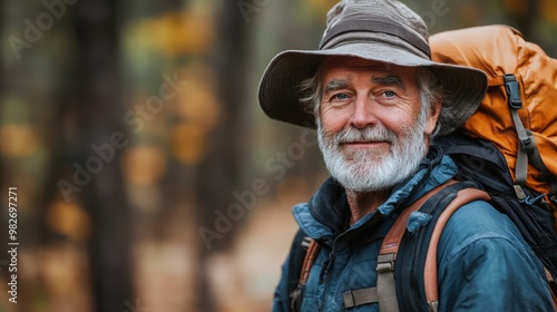© BlackBird Studio, Obraz premium Senior Traveler with Backpack in the Wilderness