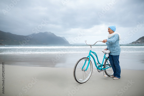 © wavebreak3, Fototapeta premium Senior woman holding teal bicycle on beach wearing beanie scarf slip-ons gazing at sea, copy space