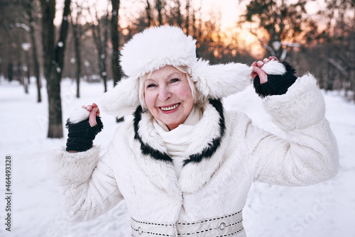 © k8most, Obraz premium senior woman in white hat and fur coat enjoying winter in snow forest. Winter, age, season concept