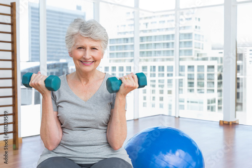 Naklejka premium Senior woman lifting teal dumbbells in fitness studio, wearing light gray...