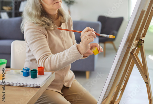 © Studio Romantic, Naklejka premium Senior woman painting on canvas with brush and paints, sitting in front of easel in home living room interior. Elderly lady holding paintbrush in hand to create picture. Art hobby, workshop concept