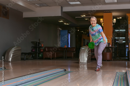 © Pixel-Shot, Obraz premium Senior woman playing bowling in club