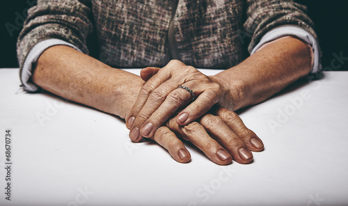 © Jacob Lund, Fototapeta premium Senior woman's hands clasped on a table